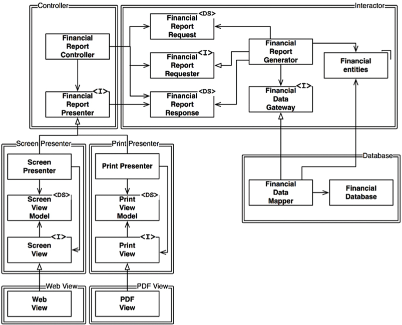So Jim and I recruited a team of three other developers and we began to work on the next few vignettes. But something went wrong. We found that the reusable framework we had created was not particularly reusable. It did not fit well into the new applications being written. There were subtle frictions that just didn’t work. This was deeply discouraging, but we believed we knew what to do about it. We went to ETS and told them that there would be a delay—that the 45,000-line framework needed to be rewritten, or at least readjusted. We told them that it would take a while longer to get that done. I don’t need to tell you that ETS was not particularly happy with this news. So we began again. We set the old framework aside and began writing four new vignettes simultaneously. We would borrow ideas and code from the old framework but rework them so that they fit into all four without modification. This effort took another year. It produced another 45,000-line framework, plus four vignettes that were on the order of 3000 to 6000 lines each. Needless to say, the relationship between the GUI applications and the framework followed the Dependency Rule. The vignettes were plugins to the framework. All the high-level GUI policy was in the framework. The vignette code was just glue. The relationship between the scoring applications and the framework was a bit more complex. The high-level scoring policy was in the vignette. The scoring framework plugged into the scoring vignette.