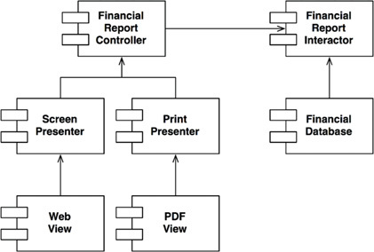 component architecture, 300–302 conclusion, 302 dependency management, 302 on process/decisions of good architect, 297–298 product, 298 use case analysis, 298–300 View Model, Presenters and Views, 213 Views component architecture, 301 Presenters and, 212–213 Vignette Grande, architects registry exam, 375–376 Visual Studio, plugin argument, 172–173 Voice technologies, archaeology projects Electronic Receptionist, 363–365 Voice Response System, 361–363 Volatile components dependency graph and, 118 design for testability, 251 placing in volatile software, 126 as problematic in Zone of Pain, 129 Stable Dependencies Principle and, 120 Von Neumann, 34 VRS (Voice Response System), archaeology projects, 361–363, 366–367 W Web as delivery system for your application, 197–198 Dependency Rule for, 205 is detail, 285–289 Web servers creating testable architecture without, 198 as option to be left open, 141, 197 writing own, 163–165 Weekly build, 112–113 Wiki text, architectural success story, 164 Y Yourdon, Ed, 29 Z Zones of exclusion avoiding, 130 relationship between abstraction/stability, 128 Zone of Pain, 129 Zone of Uselessness, 129–130