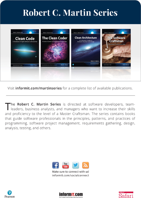 Robert C. Martin (Uncle Bob) has been a programmer since 1970. He is the co-founder of cleancoders.com, which offers online video training for software developers, and is the founder of Uncle Bob Consulting LLC, which offers software consulting, training, and skill development services to major corporations worldwide. He served as the Master Craftsman at 8th Light, Inc., a Chicago-based software consulting firm. He has published dozens of articles in various trade journals and is a regular speaker at international conferences and trade shows. He served three years as the editor-in-chief of the C++ Report and served as the first chairman of the Agile Alliance. Martin has authored and edited many books, including The Clean Coder, Clean Code, UML for Java Programmers, Agile Software Development, Extreme Programming in Practice, More C++ Gems, Pattern Languages of Program Design 3, and Designing Object Oriented C++ Applications Using the Booch Method.