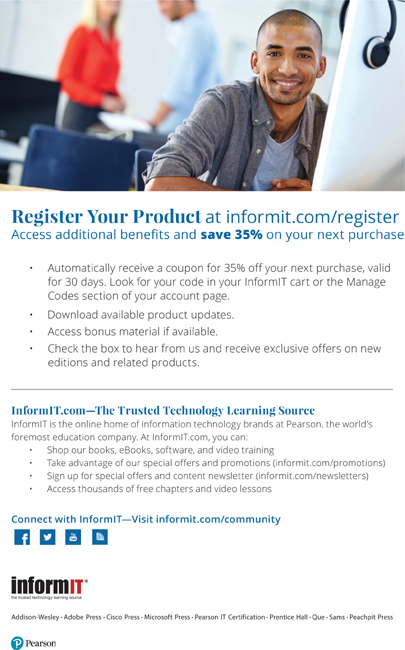 About This E-Book EPUB is an open, industry-standard format for e-books. However, support for EPUB and its many features varies across reading devices and applications. Use your device or app settings to customize the presentation to your liking. Settings that you can customize often include font, font size, single or double column, landscape or portrait mode, and figures that you can click or tap to enlarge. For additional information about the settings and features on your reading device or app, visit the device manufacturer’s Web site. Many titles include programming code or configuration examples. To optimize the presentation of these elements, view the e-book in single-column, landscape mode and adjust the font size to the smallest setting. In addition to presenting code and configurations in the reflowable text format, we have included images of the code that mimic the presentation found in the print book; therefore, where the reflowable format may compromise the presentation of the code listing, you will see a “Click here to view code image” link. Click the link to view the print-fidelity code image. To return to the previous page viewed, click the Back button on your device or app.