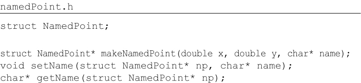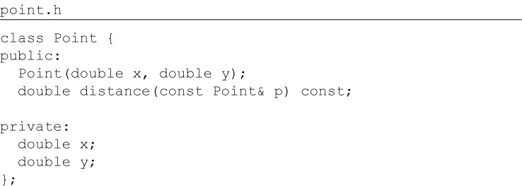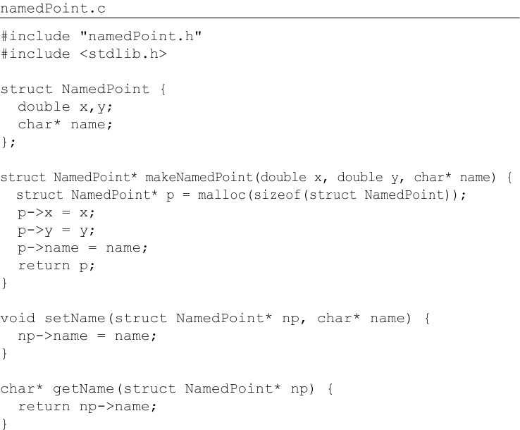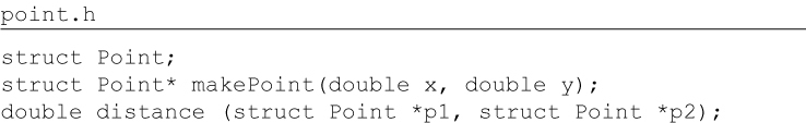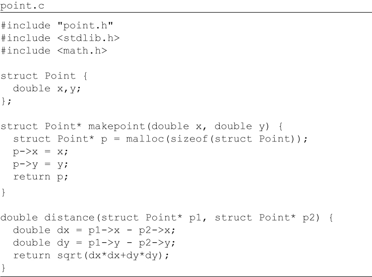 point.c #include "point.h" #include <stdlib.h> #include <math.h> struct Point { double x,y; }; struct Point* makepoint(double x, double y) { struct Point* p = malloc(sizeof(struct Point)); p->x = x; p->y = y; return p; } double distance(struct Point* p1, struct Point* p2) { double dx = p1->x - p2->x; double dy = p1->y - p2->y; return sqrt(dx*dx+dy*dy); } The users of point.h have no access whatsoever to the members of struct Point. They can call the makePoint() function, and the distance() function, but they have absolutely no knowledge of the implementation of either the Point data structure or the functions. This is perfect encapsulation—in a non-OO language. C programmers used to do this kind of thing all the time. We would forward declare data structures and functions in header files, and then implement them in implementation files. Our users never had access to the elements in those implementation files. But then came OO in the form of C++—and the perfect encapsulation of C was broken. The C++ compiler, for technical reasons,1 needed the member variables of a class to be declared in the header file of that class. So our Point program changed to look like this: