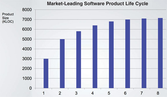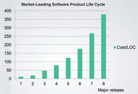 Clearly something is going wrong here. Even though every release is supported by an ever-increasing number of developers, the growth of the code looks like it is approaching an asymptote. Now here’s the really scary graph: Figure 1.3 shows how the cost per line of code has changed over time. These trends aren’t sustainable. It doesn’t matter how profitable the company might be at the moment: Those curves will catastrophically drain the profit from the business model and drive the company into a stall, if not into a downright collapse. What caused this remarkable change in productivity? Why was the code 40 times more expensive to produce in release 8 as opposed to release 1?