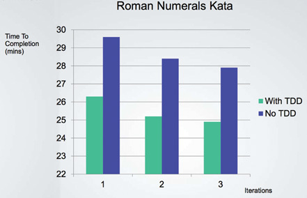 Figure 1.6 Time to completion by iterations and use/non-use of TDD