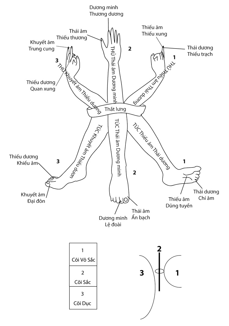 Mỗi năm có 6 khí, 12 tháng; cho nên vào trong cơ thể cũng có 6 khí 12 kinh. Vì thế mà phải phân thành 6 khí, 3 âm 3 dương, 6 kinh thủ, 6 kinh túc để ứng hợp với 6 tháng dương, 6 tháng âm trong một năm. Điều nầy người đọc hãy xem kỹ đồ biểu “6 khí, 3 âm, 3 dương phân thủ túc thành 12 kinh mạch” ở thiên thứ sáu thì rõ.