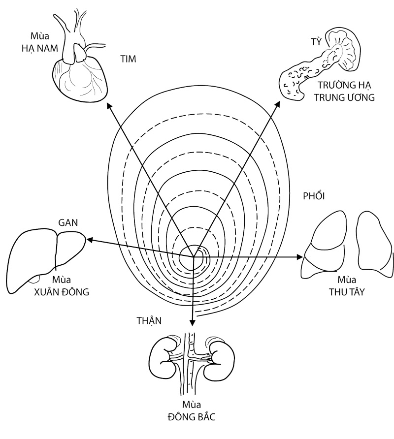 Mặt trời là một khối lửa, tạng Tim cũng là tạng lửa. Mặt trời đối với ta là cực dương, và xích đạo thường lệch về Nam, mùa Hạ là mùa nóng nhất. Cho nên tạng Tim cũng là Thái dương ở trong dương, và thông với khí mùa Hạ. Vì sao mà biết được thế? – Vì khi chưa xảy ra hiện tượng thì chỉ là đồng nhất không hai, mà đã xảy ra hiện tượng là tất có đồng loại hấp dẫn tụ về, hễ là nóng thì phải hút về lửa, lạnh thì phải qui về nước, nơi nào thế lực mạnh nơi đó là chủ động.
