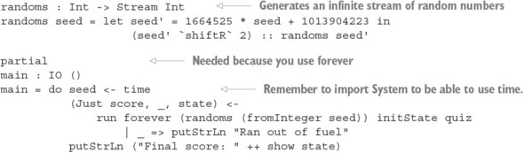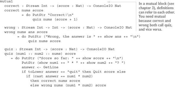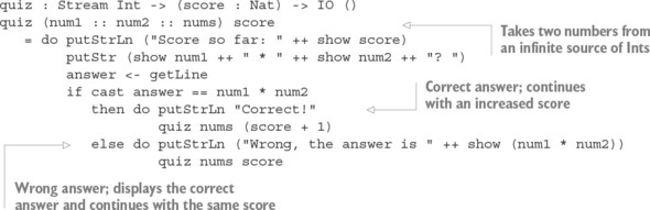 Listing 11.8. An arithmetic quiz, taking a Stream of numbers for the questions (Arith.idr)