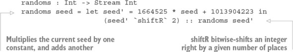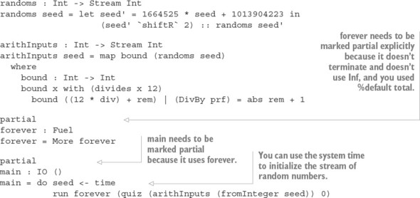Listing 11.9. Generating a stream of pseudo-random numbers from a seed (Arith.idr)