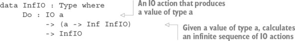 Listing 11.11. Infinite interactive processes (InfIO.idr)