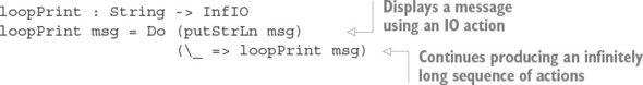 Listing 11.12. An infinite process that repeatedly displays a message (InfIO.idr)