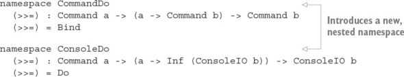 Listing 11.32. Creating two definitions of (>>=) in separate namespaces (ArithCmdDo.idr)