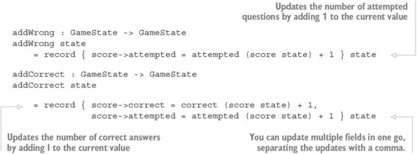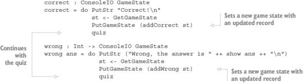 Listing 12.28. Processing correct and wrong answers by updating the game state (ArithState.idr)