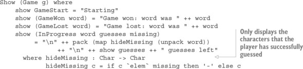 Listing 14.12. A Show implementation for Game (Hangman.idr)