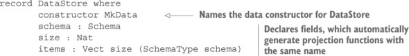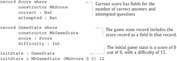 Danh sách 12.21. Đại diện cho trạng thái trò chơi dưới dạng bản ghi lồng nhau (ArithState.idr)