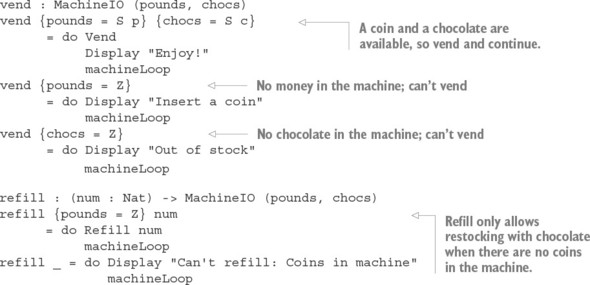 Danh sách 13.6. Thêm các định nghĩa của vend và refill kiểm tra rằng các điều kiện tiên quyết của chúng được thỏa mãn (Vending.idr)