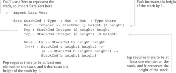 Danh sách 13.7. Đại diện cho các phép toán trên cấu trúc dữ liệu ngăn xếp với chiều cao đầu vào và đầu ra của ngăn xếp trong loại (Stack.idr)