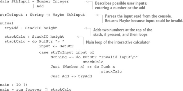 Danh sách 13.12. Phác thảo của một máy tính dựa trên ngăn xếp tương tác (StackIO.idr)