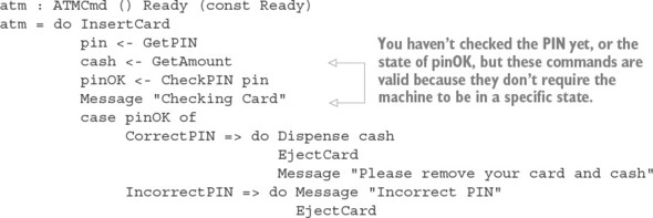 Danh sách 14.3. Một kiểu để đại diện cho các lệnh của một ATM và cách chúng ảnh hưởng đến trạng thái của ATM (ATM.idr)