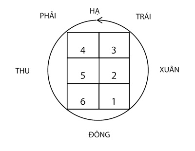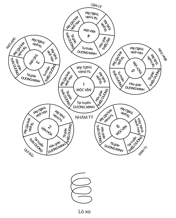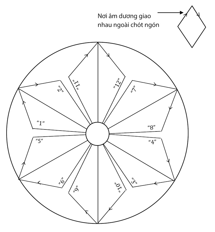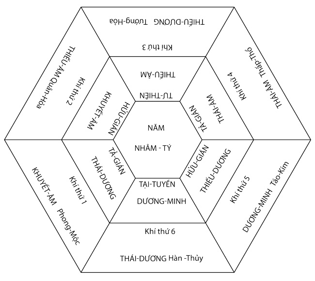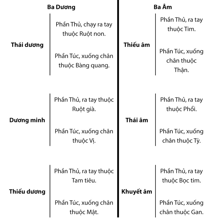 Mỗi năm có 6 khí, 12 tháng; cho nên vào trong cơ thể cũng có 6 khí 12 kinh. Vì thế mà phải phân thành 6 khí, 3 âm 3 dương, 6 kinh thủ, 6 kinh túc để ứng hợp với 6 tháng dương, 6 tháng âm trong một năm. Điều nầy người đọc hãy xem kỹ đồ biểu “6 khí, 3 âm, 3 dương phân thủ túc thành 12 kinh mạch” ở thiên thứ sáu thì rõ.