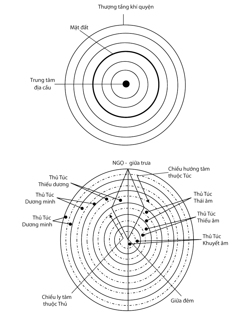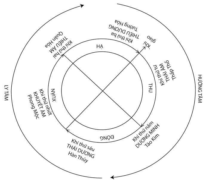 Đã căn cứ vào luật ly tâm hướng tâm của bầu khí quyện và sáu khí âm dương của trời đất, mà trong con người có 3 âm 3 dương. Thế là cả âm dương đều chỉ đến mức thứ ba là cùng cực. Dương đi ra đến mức cùng cực là phải trở vào âm, âm đi vào đến mực cùng cực là phải trở ra dương. Nếu không như thế, tức là sinh cơ đã bị gián đoạn.